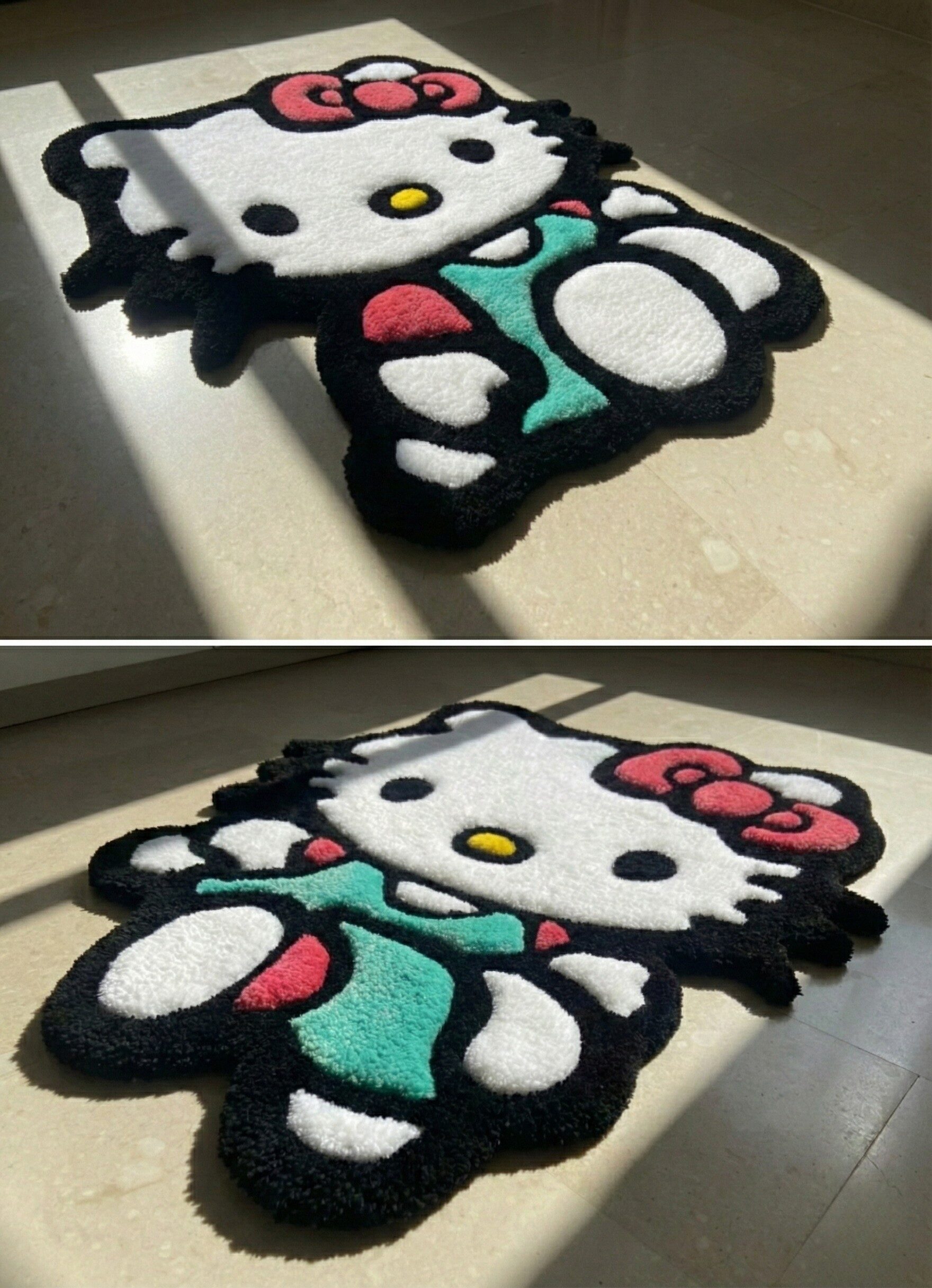 A charming green tufted rug featuring Hello Kitty, adding a fresh and playful touch to any room—perfect for fans who love a unique twist on a classic character.